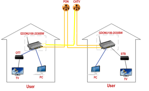Overview        GDONU100-2030B is FTTH slaver combined EPON ONU and CATV optical receiver in one box. GDONU100-2030B series are optical network terminal targeting FTTH networking strategy. GDONU100-2030B includes a variety of models covering EPON SFU data type and double optical fiber type. The double optical fiber type is composed of CATV optical receiver and ONU; CATV optical receiver has the feature of low optical power receiving while ONU adopts compatible chips with EPON. In all, this series is well positioned to fulfilling different FTTH networking requirement, providing reliable and secure service that come in all varieties. Features              ONU :